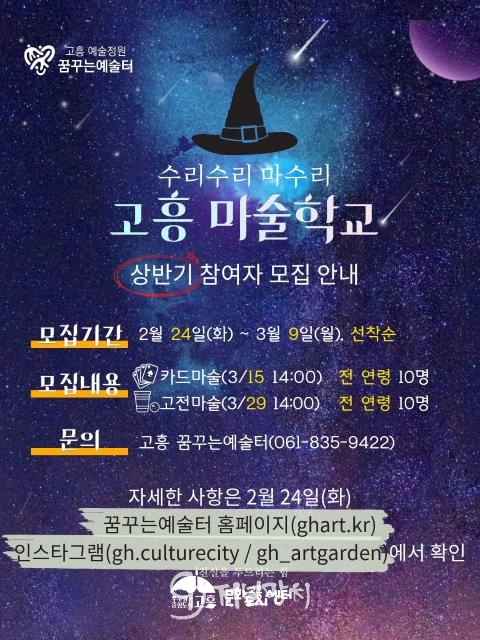 고흥군 문화도시센터 권지애 센터장은 “마술은 생애주기별 발달 과정에서 중요한 창의력과 집중력 향상, 자신감 형성에 도움을 주는 예술 장르”라며 “누군가에게 작은 놀라움을 선물할 수 있는 마술의 매력을 직접 경험해 보시기를 바란다.”고 했다.