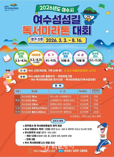 시 관계자는 “여수섬섬길 독서 마라톤 대회는 독서를 일상 속 즐거운 도전으로 만들어 시민들이 자연스럽게 책과 가까워질 수 있도록 기획한 프로그램”이라며 “가족과 이웃이 함께 참여하는 독서문화 확산의 계기가 되길 기대한다.”고 했다.