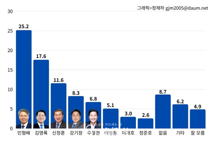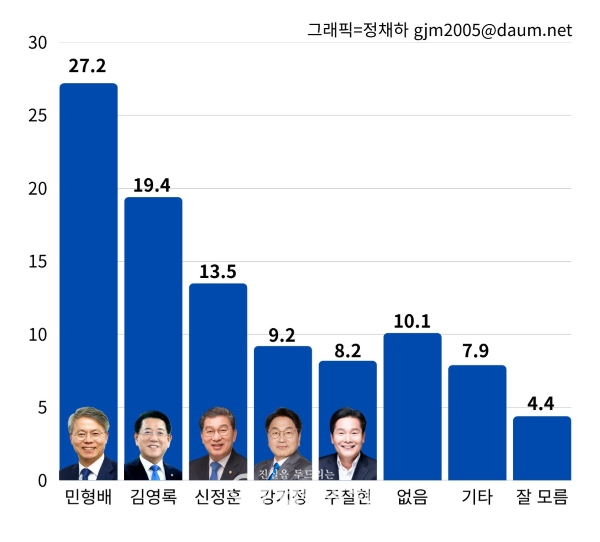 조사를 주관한 뉴스1 광주전남취재본부와 남도일보에 따르면 민형배 국회의원(25.2%)과 김영록 현직 전남도지사(17.6%)가 2강 구도를 형성했다.