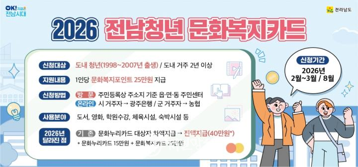 전남 청년 문화복지카드는 지역 청년에게 문화 활동비를 지원해 문화생활과 자기계발 기회를 제공하는 사업으로, 대상자 1인당 연 25만 원의 문화복지 포인트를 지급한다.