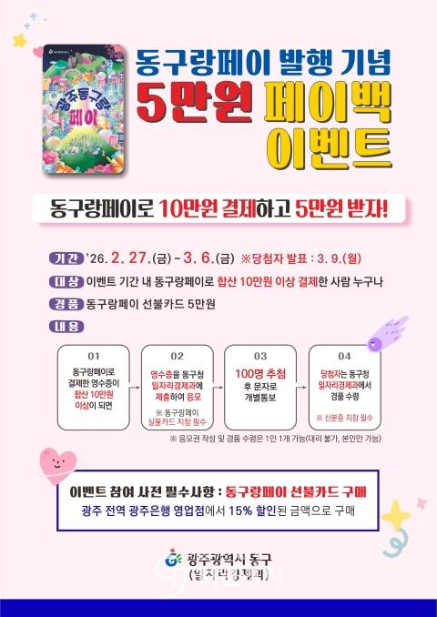 한편 동구랑페이 선불카드는 지난 23일 발행을 시작했으며, 광주 전역 광주은행 영업점에서 15% 할인된 금액으로 구매할 수 있다. 동구는 이번 페이백 이벤트가 지역경제 활성화에 긍정적인 효과를 가져올 것으로 기대하고 있다.