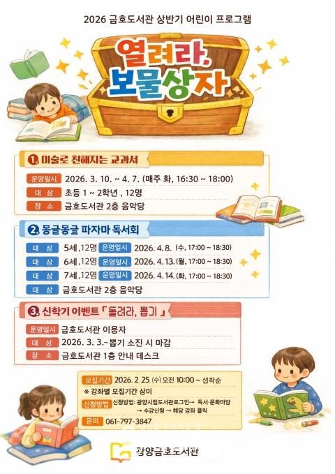 한편, 2026년 금호도서관 상반기 어린이 프로그램과 관련한 자세한 사항은 광양시립도서관 누리집(https://lib.gwangyang.go.kr)에서 확인하거나 금호도서관(☎061-797-3847)으로 문의하면 안내받을 수 있다.