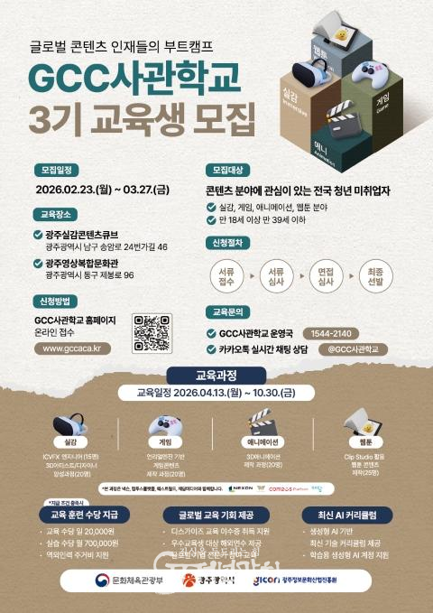 3기 교육생 모집은 GCC사관학교 공식 누리집(https://www.gccaca.kr)을 통해 진행하며, 콘텐츠 분야에 관심 있는 만 18세부터 39세까지의 전국 청년 미취업자이면 누구나 지원할 수 있다.
