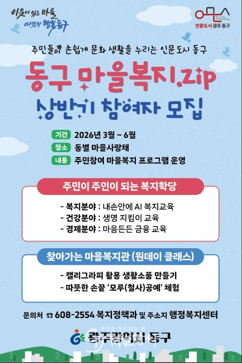 ‘마을복지.ZIP’은 주민이 생활 속에서 복지를 자연스럽게 배우고 이웃과 소통하며 정이 넘치는 마을공동체를 만들기 위한 동구 대표 마을복지사업이다. 올해는 ▲이웃 간 안부 인사 캠페인 ▲우리동네 복지 홍반장 ▲주민이 주인이 되는 복지학당 ▲찾아가는 마을복지관 등 다양한 프로그램을 운영한다.
