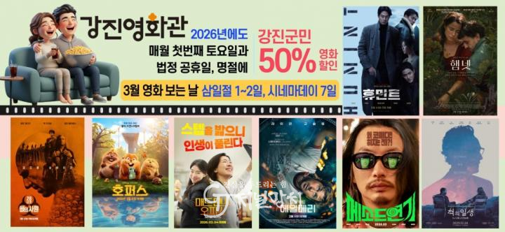 이번 3월 행사는 삼일절을 맞아 3월 1일~ 2일까지 이틀간 진행되며, 첫 번째 토요일인 3월 7일까지 총 3일간 운영된다. 해당 기간 동안 강진군민임을 확인할 수 있는 신분증 등 증빙자료를 제시하면 군민 누구나 50% 할인된 금액으로 영화 관람을 즐길 수 있다.