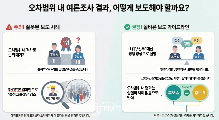 또한 전체 조사결과를 반영하지 않은 채, 성별·연령대·지역별 하위표본 결과만을 근거로 ‘50대에서 1위’, ‘○○권역에서 앞서’ 등 특정 정당이나 후보자에게 유리하도록 부각하는 보도 역시 주의가 필요하다.