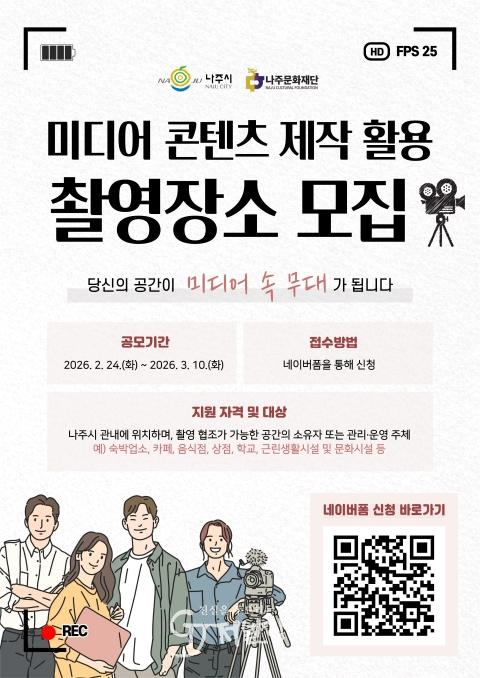 나주문화재단은 지역 자원의 효과적인 홍보와 소상공인 지원을 위해 ‘미디어 콘텐츠 촬영 장소’를 오는 3월 10일까지 공개 모집한다고 26일 밝혔다.