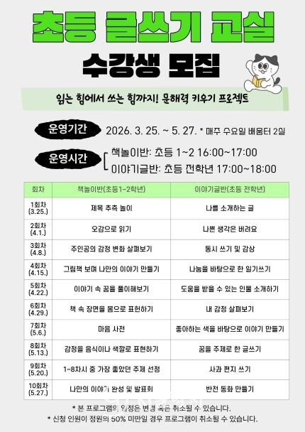 책놀이반은 다양한 책놀이 중심 활동을 통해 기초 문해력을 자연스럽게 익히도록 돕고, 이야기글반은 주제 탐구와 글쓰기 활동을 통해 사고력과 표현력 향상에 중점을 두고 운영될 예정이다.