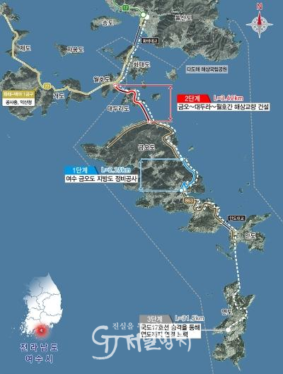 금오도 지방도 정비공사는 총 3단계로 추진된다. 1단계 금오도 내 기존 도로포장 정비(’26년, L=2.25㎞), 2단계 월호도~대두라도~금오도 구간 해상교량건설(’27~’33년, L=3.42㎞), 3단계는 지방도 863호선을 국도 17호선으로 승격하여 연도까지 연결하는 공사로 현재는 구상단계에 있다.