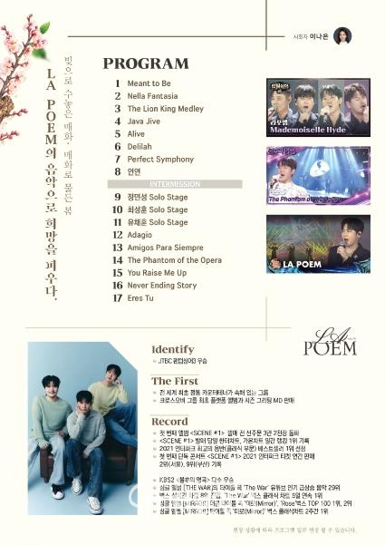 라포엠은 JTBC 예능 ‘팬텀싱어 3’의 우승 팀으로, 클래식과 팝을 넘나드는 독보적인 하모니와 무대 장악력으로 큰 사랑을 받아왔다. 이번 공연에서는 대표곡 ‘Mean to Be’, ‘Alive’을 비롯해 ‘The Phantom of the Opera’, ‘Nella Fantasia’, ‘Never Ending Story’, ‘인연’ 등 성악과 오페라, 영화음악과 K-POP을 아우르는 다채로운 무대를 선보일 예정이다.