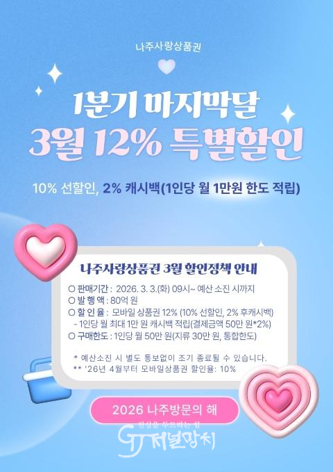 나주시 관계자는 “3월 할인율 상향은 1분기 소비 진작을 마무리하는 중요한 결정”이라며 “앞으로도 지역 상권에 실질적인 도움이 되는 탄력적인 할인 정책을 지속 추진하겠다.”고 했다.