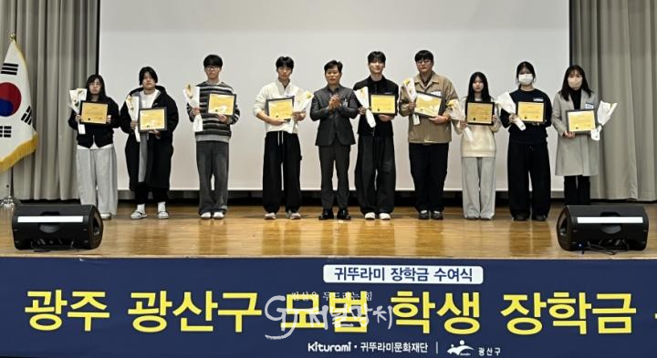 광산구에 따르면, 귀뚜라미문화재단은 이날 구청 7층 윤상원홀에서 2026년 장학금 수여식을 열고 광산구 고등학생 25명, 대학생 20명 등 총 45명에게 장학금을 전달했다.
