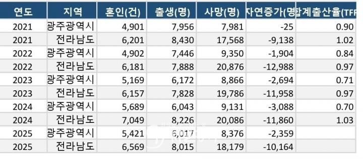 실제로 전남과 광주의 인구 구조는 심각한 상황에 놓여 있다. 2024년 기준 광주는 출생아 6,043명, 사망자 9,131명으로 자연증가는 –3,088명을 기록했고, 합계출산율도 0.70까지 떨어졌다. 전남 역시 출생아 8,226명, 사망자 2만86명으로 자연증가 –1만1,860명을 기록하며 지방 소멸 위기가 현실화되고 있는 상황이다.
