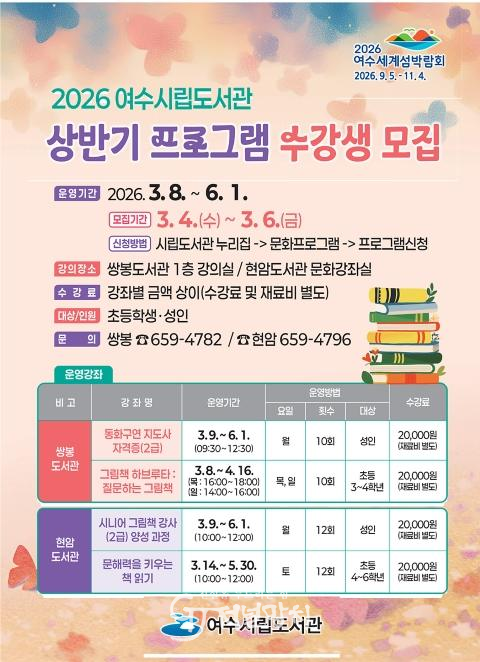 수강 신청은 여수시립도서관 누리집(yslib.yeosu.go.kr)을 통해 가능하다. 수강료와 재료비는 강좌별로 다르며, 전액 본인 부담이다.