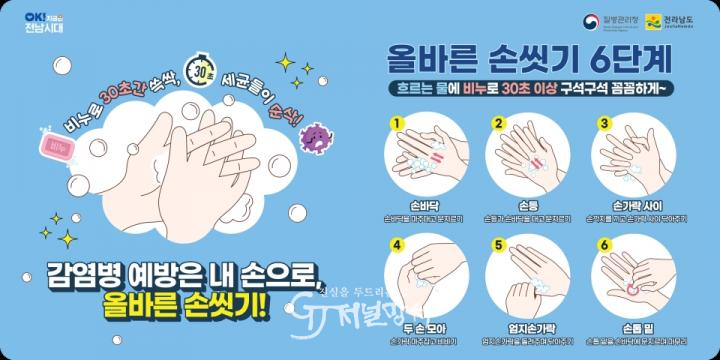 정광선 전남도 보건복지국장은 “손 씻기는 가장 간단하지만 가장 효과적인 감염병 예방법”이라며 “도민 한 사람 한 사람의 작은 실천이 지역사회 전체의 건강을 지키는 힘이 되는 만큼, 생활 속 개인위생 실천에 적극 동참하길 바란다.”고 했다.