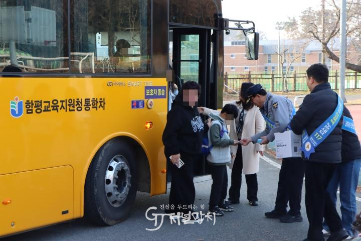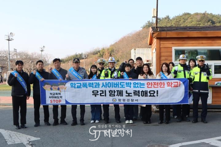 함평경찰은 함평초등학교 정문 앞에서 함평초등학교장 및 교직원, 녹색어머니회 등 25명과 함께 등교하는 학생들을 대상으로 학교 폭력 예방 캠페인을 진행하며 교육물품을 배부했다.