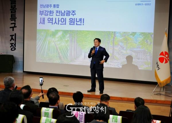 강기정 광주시장은 ‘전남광주통합특별시 설치를 위한 특별법’의 주요 내용과 20조원 규모의 정부 재정 지원이 가져올 변화에 대해 설명하고, 통합 이후 담양군의 발전전략을 제시했다.