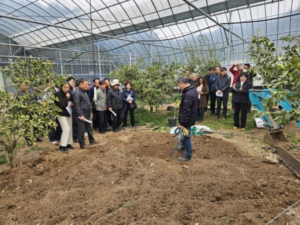 특히 묘목 식재 시에는 접목부가 토양에 묻히지 않도록 지면보다 약간 높게 심고, 뿌리가 자연스럽게 퍼지도록 하는 것이 중요하다는 점을 강조했다. 이어 식재 후 지주 설치와 초기 생육 관리 방법을 설명했다.