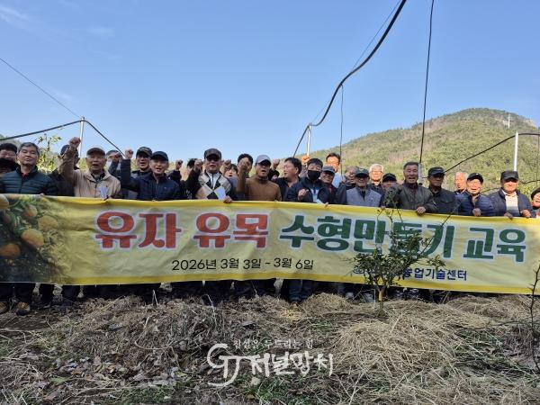 이번 교육은 유자 재배 초기 단계에서 가장 중요한 유목 수형 관리와 식재 기술을 중심으로 이론 교육과 현장 실습을 병행해 진행됐다.