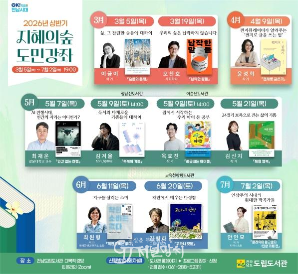 도립도서관은 현장 참여가 어려운 원거리 도민을 위해 온라인 강연을 실시간으로 제공한다. 또한 전남지역 공공도서관과 함께 ‘찾아가는 도민 강좌’도 운영한다. 5월 9일 장흥 정남진도서관과 여수 이순신도서관, 6월 20일 전남도교육청함평도서관에서 강좌가 진행될 예정이다.