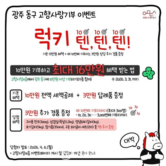이벤트 기간은 이달 1일부터 31일까지이며, 고향사랑기부 공식 플랫폼 ‘고향사랑e음’을 통해 광주 동구에 10만 원 이상 기부한 사람을 대상으로 한다. 누적 기부 순서 기준으로 10번째, 20번째, 30번째 등 매 10번째 기부자에게 3만 원 상당의 답례품을 추가 제공하며, 최대 3,000번째 기부자까지 총 300명이 혜택을 받게 된다.