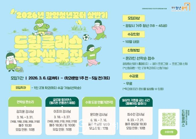 광양시 관계자는 “이번 드림클래스는 설계 단계부터 청년들의 의견을 반영한 만큼 참여 만족도가 높을 것으로 기대한다. 청년들이 꿈터에서 취미와 배움을 매개로 자연스럽게 교류하고 네트워크를 형성할 수 있도록 지원하겠다.”고 했다.