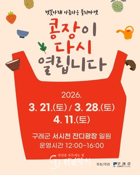 군 관계자는 “그동안 콩장을 그리워하던 군민들이 많아 지역경제 활성화 차원에서 플리마켓을 다시 개최하게 됐다. 다시 시작하는 ‘콩장’이 구례의 아름다운 자연 속에서 판매자와 소비자가 함께 어우러져 즐거움을 나누는 공간으로 성장하길 기대한다.”고 했다.