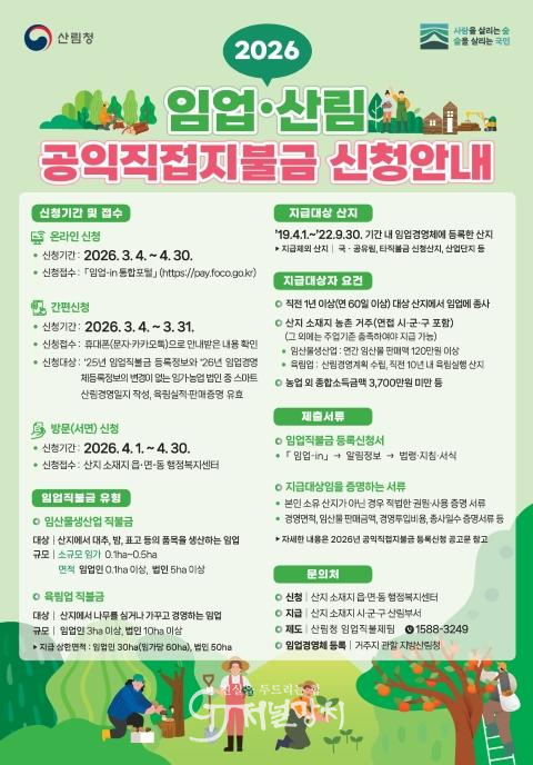 군 산림정원과 관계자는 “올해는 온라인 신청 기간을 충분히 확보해 임업인들이 더 편리하게 신청할 수 있게 됐다. 컴퓨터나 스마트폰 사용이 어려운 분들은 4월 중 읍·면사무소를 방문해 기한 내 신청할 수 있도록 홍보에 최선을 다하겠다.”고 했다.