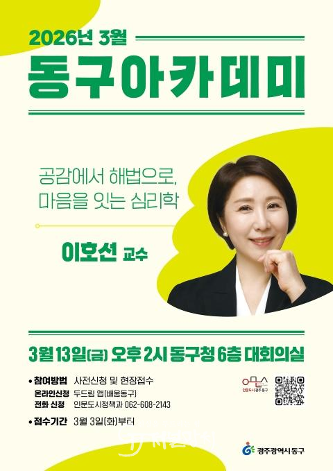 동구 아카데미는 지난 2007년 시작해 올해로 20년째를 맞은 동구 대표 교양 강좌로, 매년 다양한 분야의 전문가를 초청해 주민들에게 폭넓은 배움의 기회를 제공해 왔다. 인문·심리·예술·건강 등 생활 밀착형 주제를 다루며 주민들의 호응을 얻고 있다.