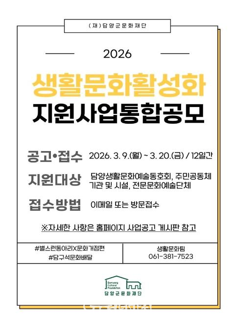 해당 사업은 ▲2026 생활문화예술 동아리지원사업 <별스런동아리_문화거점편> ▲2026 찾아가는 문화예술지원사업 <담구석문화배달> 총 2개 사업으로 담양군 읍·면 단위 지역민들의 일상 속에서 문화예술을 경험하고 참여할 기회를 확대하기 위해 추진된다.