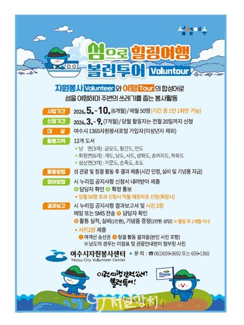 참여 대상은 여수시 1365자원봉사포털에 등록된 성인이면 누구나 가능하며 희망자는 12개 섬 가운데 한 곳을 선택해 이메일로 신청서를 제출하면 된다. 다만, 원활한 운영을 위해 활동 희망 월의 전월 20일까지 신청을 마쳐야 한다.