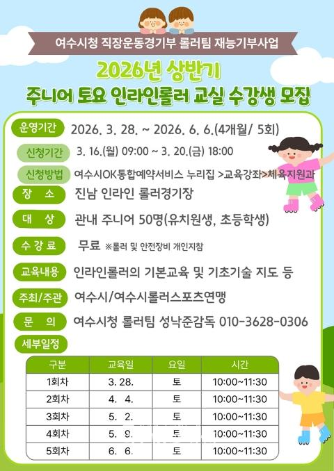 이번 프로그램은 관내 유치원생과 초등학생 50명을 대상으로 진행되며 여수시청 직장운동경기부 롤러팀 선수들이 재능기부 형식으로 직접 지도에 나선다.