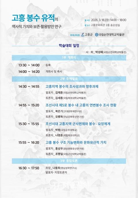 군 문화체육과 관계자는 “고흥만의 독보적인 역사 자산인 봉수 유적의 가치를 학계 및 군민과 공유하는 뜻깊은 자리”라며 “조사 성과를 바탕으로 소중한 문화유산을 다음 세대에 온전히 전승하고 보존하는 데 최선을 다하겠다.”고 했다.
