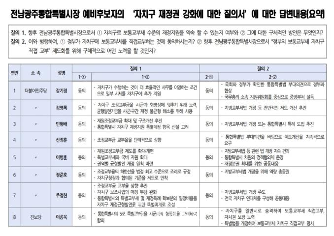 앞서 협의회는 통합특별시장 예비후보자들에게 ▲통합특별시 출범 이후 자치구에 대한 보통교부세 수준의 재정지원 약속 여부 및 구체적 실행 방안 ▲정부의 보통교부세 자치구 직접 교부에 대한 입장 및 제도화 노력 방안 등을 질문한 바 있다.
