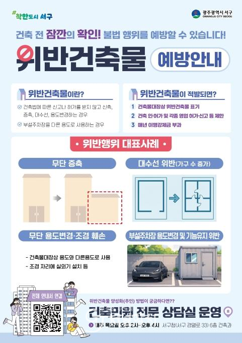 또 사용승인 이후 2년 이내 건축법 위반행위가 집중 발생하는 점을 고려해 건축물 사용승인 단계에서 건축주에게 예방 사례집을 직접 발송하는 등 사전 안내를 강화할 계획이다. 사례집은 서구청 누리집에도 게시해 누구나 확인할 수 있도록 할 예정이다.