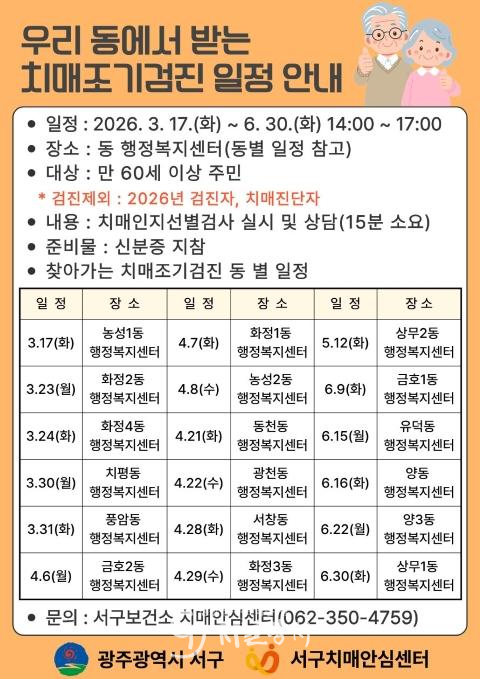 검진 대상은 치매 진단을 받지 않은 만 60세 이상 서구 주민이다. 검진은 기억력, 주의집중력, 언어기능, 이해·판단력 등을 확인하는 문진식 인지선별검사(CIST)를 중심으로 진행한다. 검사 결과 치매가 의심되는 경우에는 치매안심센터에서 신경심리검사 등 진단검사를 실시하고 필요 시 협약병원 감별검사까지 연계해 정확한 진단과 체계적인 관리가 이뤄지도록 지원할 계획이다.