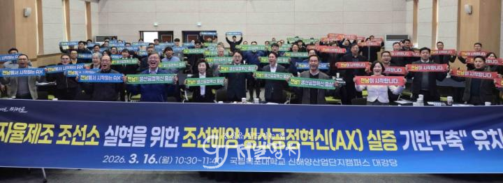 참석자들은 조선산업 AX 추진의 핵심 기반이 될 산업통상부의 ‘조선해양 생산공정혁신(AX) 지원 기반구축사업’ 유치 공감대 확산을 위한 피켓 퍼포먼스도 펼쳤다.
