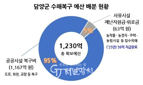 담양군이 확보한 복구비 1,230억 원은 크게 ‘공공시설 복구비(1,167억 원)’와 ‘사유시설 재난지원금·위로금(63억 원)’으로 나뉜다.