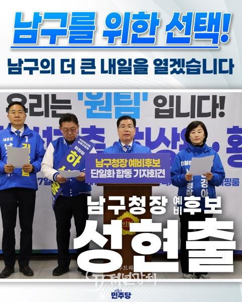 성현출 예비후보는 “이번 단일화 합의는 단순한 정치적 연대가 아닌, 남구 발전을 위한 절박한 결단이다. 경선 과정에서 그 어떤 네거티브도 없이 오직 정책과 비전으로 평가받겠다.”고 했다.