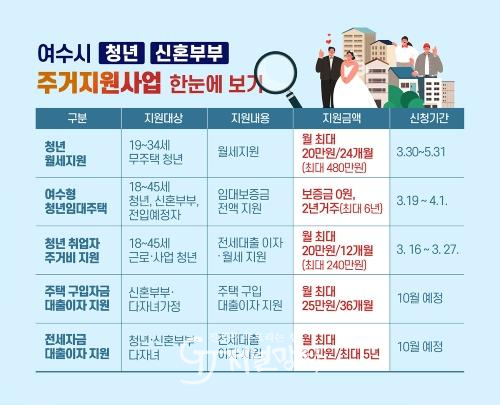 ![]() 여수시는 청년과 신혼부부의 주거비 부담 완화를 위해 월세, 임대주택, 전세․주택구입 대출이자 지원 등 다양한 주거지원 정책을 추진하고 있다. |