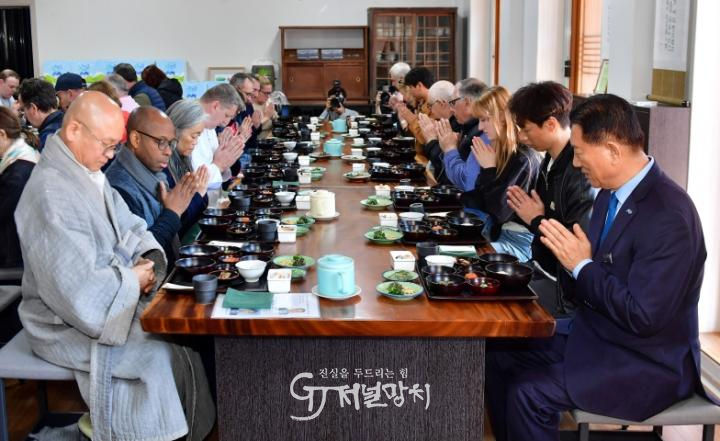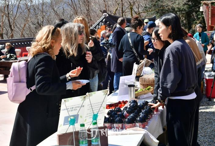 백양사 천진암에 도착한 셰프들은 ‘사찰음식 명장’ 정관스님과 함께 한국의 전통 음식문화를 체험했다. 유기농 표고버섯, 미나리, 깻잎, 방울토마토, 딸기, 레몬, 토종생강, 두부 등 식재료는 장성친환경농업협회가 준비했다. 인공 조미료 없이 자연의 맛을 살린 사찰음식과 수행자의 철학을 담은 조리 과정에 깊이 감명받았다는 후문이다.