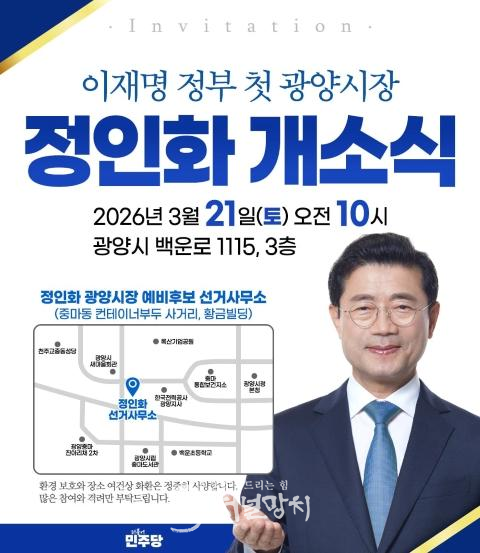 이번 개소식은 정 예비후보가 민선 9기 광양시장 재선 도전을 공식화한 이후 처음으로 여는 대규모 행사로 지역 주요 인사와 지지자들이 대거 참석할 것으로 예상된다.