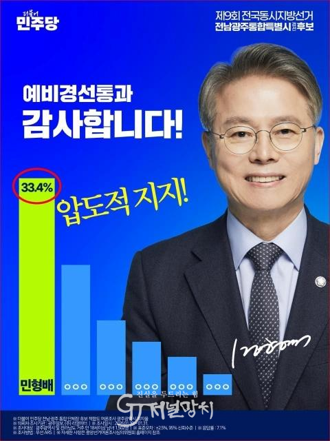 그러나 정작 민형배후보에게 확인한 바에 따르면 민형배측이 배포한 ‘예비경선 통과 감사합니다’라는 제목의 카드를 만들어 33.4%의 앞도적 지지를 받은 것처럼 교묘히 조작된 카드를 퍼날랐다.