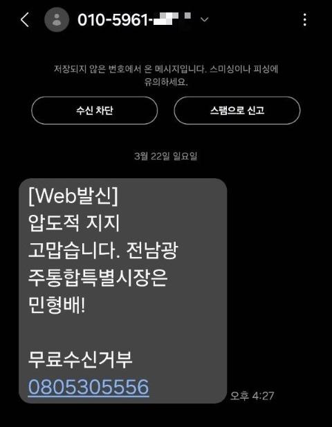 끝으로 “민형배 의원 자신은 가짜 찌라시의 피해자인 것처럼 주장하면서 정작 예비경선 결과를 교묘한 편집기술과 문구로 시도민의 여론을 호도하고 있다. 적반하장의 태도로 당원들을 호도하고, 기만하는 민형배 의원에게 대국민 사과를 강력히 요구한다.”고 했다.