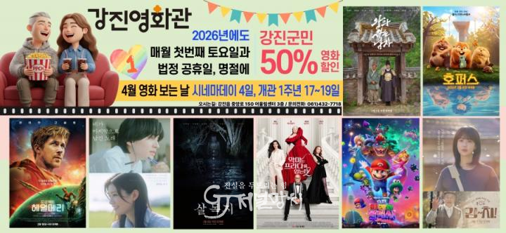 강진군은 4월에도 ‘영화 보는 날’ 행사를 이어갈 계획이다. 4월 행사는 첫 번째 토요일인 4월 4일과, 개관 1주년을 기념하는 4월 17일부터 19일까지 사흘 동안 진행할 예정이다.