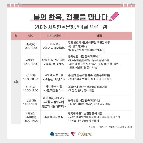 허성자 체육관광과장은 “서창한옥문화관을 전통문화 체험과 지역 관광을 잇는 문화 거점으로 만들겠다.”며 “봄기운 가득한 서창에서 소중한 사람들과 특별한 추억을 만들길 바란다.”고 말했다.