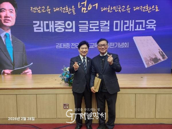 ![]() 강성휘 목포시장 예비후보가 지난 2월 28일 열린 김대중 교육감의 출판기념회에서 기념사진을 찍고 있다 |