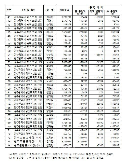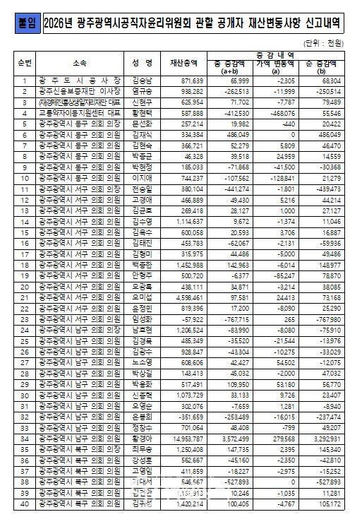 광주광역시 공직자윤리위원회는 공개된 재산변동 사항에 대해 6월말까지 성실신고 여부를 심사할 계획이다.