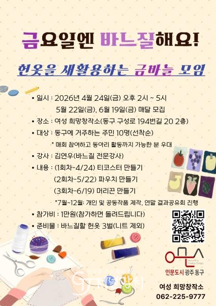 모집 대상은 동구에 주소를 둔 주민 10명(선착순)이며, 세 차례 모두 참여하고 이후 동아리 활동까지 가능한 주민을 우대한다. 참가비는 1인당 1만 원으로, 프로그램 종료 후 전액 환급된다. 준비물은 바느질에 사용할 헌옷 3벌(니트류 제외)이다.