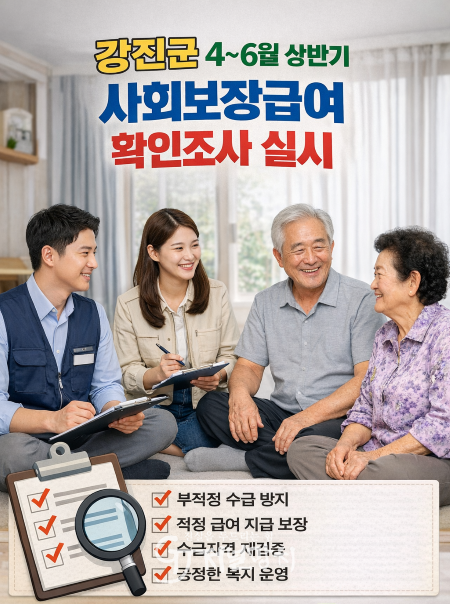 강진군은 조사 과정에서 대상자에게 충분한 소명 기회를 제공하고 자격 변동이 예상되는 가구에는 사전 안내와 상담을 진행하는 한편, 생활 여건이 급격히 악화한 위기가구는 적극 발굴해 긴급복지 등 맞춤형 지원으로 연계함으로써 군민의 수급권 보호와 복지 사각지대 해소에 힘쓸 방침이다.